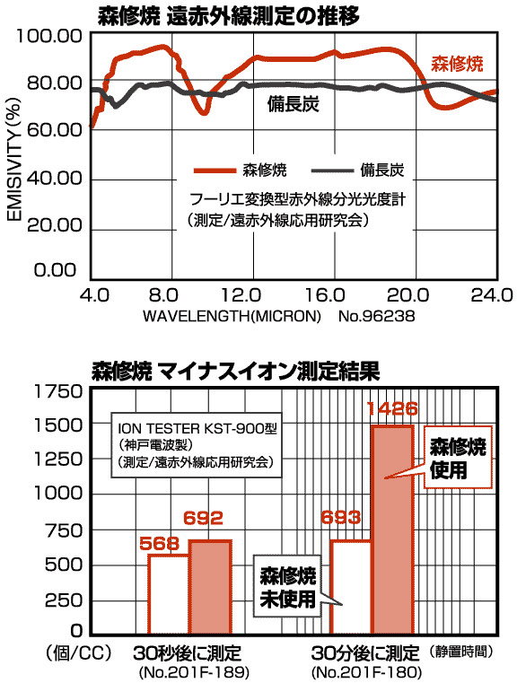 健康の源は食事から・・・食材と同様、毎日使う食器にも気を配りたい。『森修焼しんしゅうやき』は鉛やカドミウムなどの有害物質を一切使用せず、長年の石の研究による独自ブレンドの高純度天然石を釉薬とした安全な陶器です。備長炭を上回る豊富な遠赤外線が食材本来の旨味や香りを醸し出し、体を温めます。森修焼 遠赤外線測定の推移とマイナスイオン測定結果(クリックで拡大)